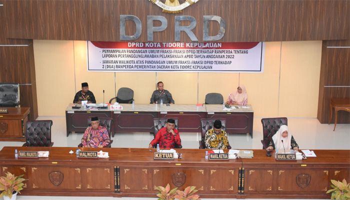 Jawaban Walikota tersebut yakni Pandangan Umum Fraksi-fraksi DPRD atas 2 buah Rancangan Peraturan Daerah (Ranperda) Kota Tidore Kepulauan,