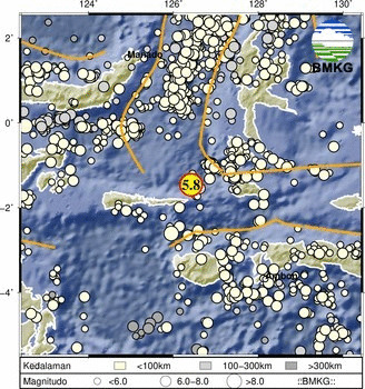 Jazirah Indonesia – Badan Meteorologi klimatologi dan Geofisika (BMKG) merilis terjadi gempa bumi berkekuatan magnitudo 5,8 mengguncang wilayah Sanana, Kepulauan Sula, Maluku Utara, pada Kamis, 17 Juli 2023 sekira pukul 13.42 Wit.