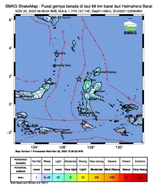 Berdasarkan hasil analisa BMKG, titik gempa bumi tersebut berada pada koordinat 77 LU,127.14 BT atau berada 68 km Barat Laut Halmahera Barat dengan kedalaman 109 Km. Gempa ini tidak berpotensi Tsunami.