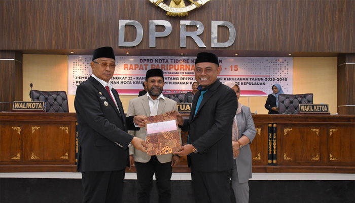 Persetujuan tersebut disampiakan juru bicara DPRD Kota Tidore Kepulauan Elvri Habib saat menyampaikan laporan hasil proses pembahasan, pendapat fraksi dan hasil pembicaraan tingkat I (Pertama) yang diagendakan pada rapat paripurna ke 15 masa persidangan III Tahun 2024 tentang Pembicaraan Tingkat II Ranperda RPJPD Kota Tidore Tahun 2025-2045, di Gedung DPRD Kota Tidore Kepulauan, Kamis (22/8/2024).