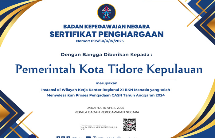 Kali ini, Pemkot Tidore resmi menerima penghargaan dari Badan Kepegawaian Negara (BKN) atas keberhasilan menyelesaikan proses pengadaan CASN Tahun Anggaran 2024, di wilayah kerja Kantor Regional XI BKN Manado.