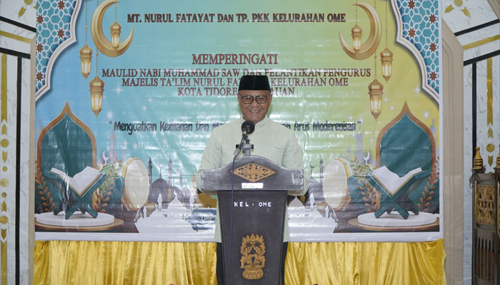 Lintas3.com, Tidore – Wali Kota Tidore Kepulauan Muhammad Sinen bersama Ketua Tim Penggerak PKK Kota Tidore Kepulauan, Hj. Rahmawaty Muhammad Sinen menghadiri Peringatan Maulid Nabi Muhammad SAW 1447 Hijriah di Masjid Al-furqan Kelurahan Ome.