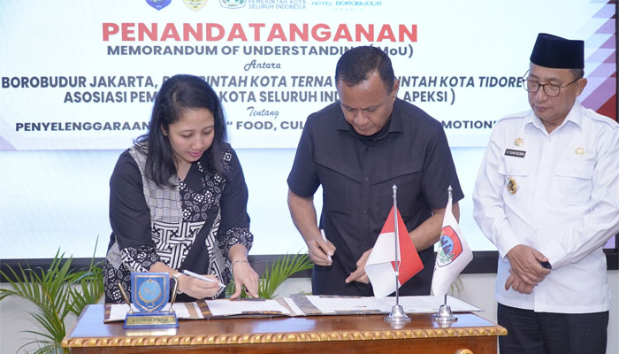 Lintas3.com – Langkah besar untuk mendorong sektor pariwisata dan ekonomi daerah resmi dimulai, bertempat di Kantor Bappelitbangda Kota Ternate, Rabu (1/4/2026) Pemerintah Kota Tidore Kepulauan dan Pemerintah Kota Ternate resmi teken Memorandum of Understanding (MoU) dengan Hotel Borobudur Jakarta dan Asosiasi Pemerintah Kota Seluruh Indonesia (APEKSI) terkait penyelenggaraan program “Food, Culture & Tourism Promotion”.